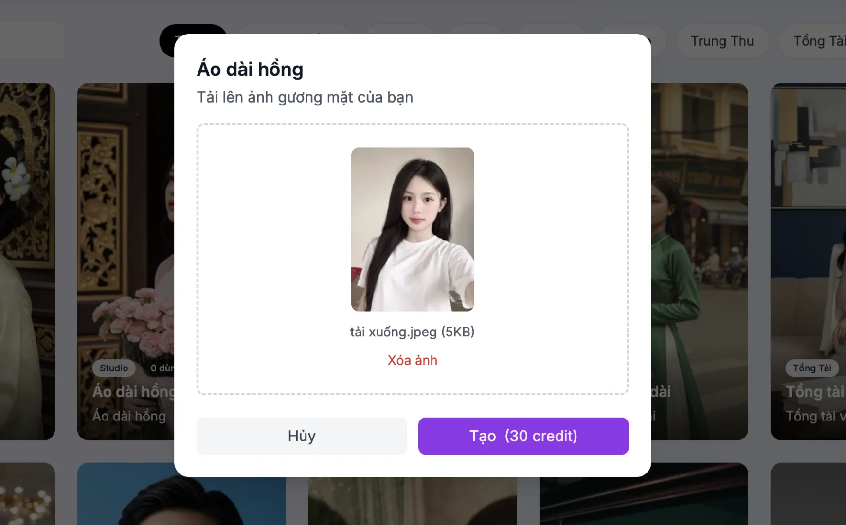 Nhấn “Tạo ảnh” (Generate) – hệ thống AI sẽ tự động ghép, chỉnh màu và thêm họa tiết Tết đẹp mắt